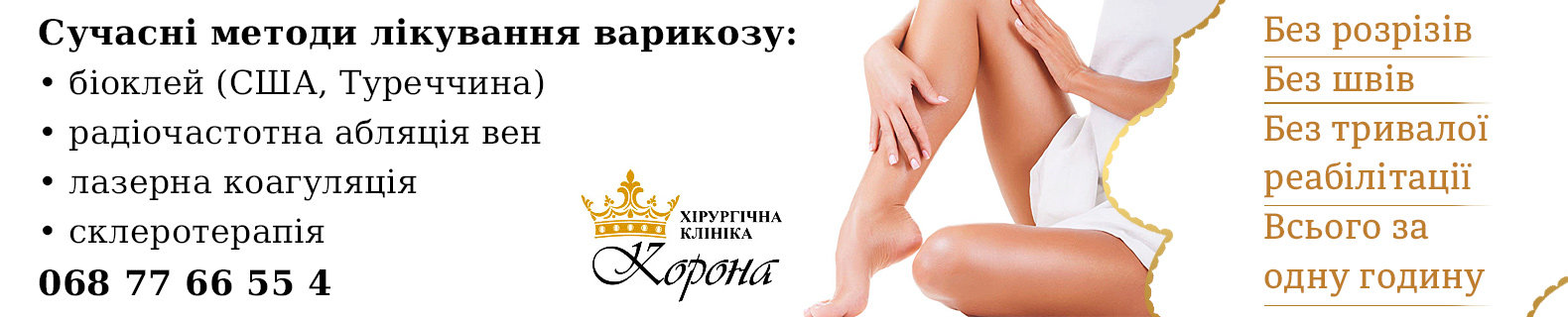 Флебологи медичного центру Корона у Львові поряд з традиційними хірургічними методами, такими як склеротерапія і класична флебектомія, для лікування варикозу використовують безопераційний метод - ендовенозну лазерну коагуляцію ЕВЛК, по простому – лікування варикозу лазером у Львові. Суть методу полягає в тому, що в просвіті великої підшкірної (основної) вени з місцевим знеболенням під контролем УЗД за допомогою лазерного світловоду проводиться коагуляція вени. Вона немов склеюється і по ній припиняється кровотік. Вена стає непрохідною і з плином часу, приблизно через рік, набуває вигляду сполучнотканинного шнура. На даний момент, ендовенозну лазерна коагуляція вен є найбільш малотравматичною процедурою лікування варикозу.