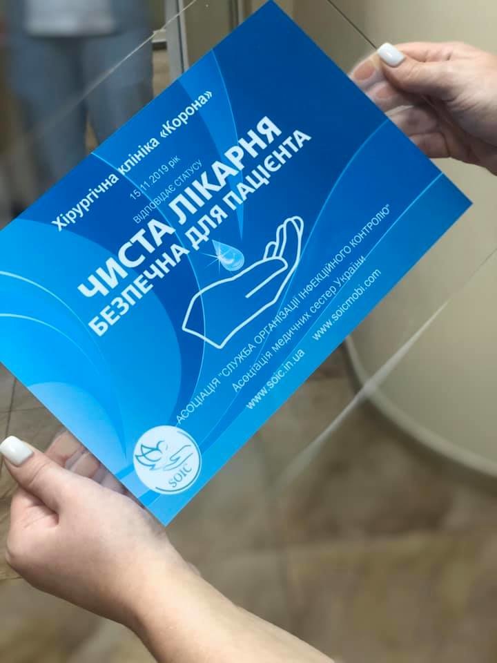 Асоціація «Служба організації інфекційного контролю» після ретельної перевірки, вирішила нагородити клініку сертифікатом «Чиста лікарня безпечна для пацієнта».